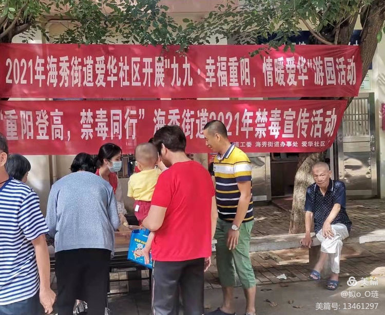 10月12日下午,秀英区海秀街道联合爱华社区在外运宿舍开展“重阳登高,禁毒同行”禁毒宣传活动。